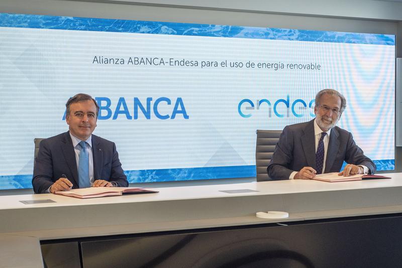 Abanca y Endesa han suscrito un acuerdo de colaboración en energía renovable para cubrir con energía de origen gallego el 70% de la demanda de electricidad de la entidad financiera de los próximos diez años.