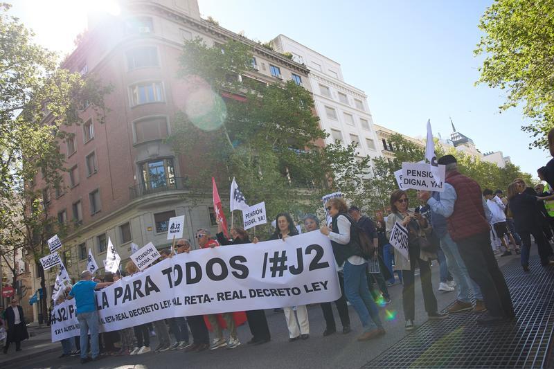 Abogados y procuradores afectados por las mutualidades se han manifestado este sábado en Madrid por unas jubilaciones y prestaciones "dignas", en una concentración convocada por el movimiento J2: "Necesitamos una solución global para todo el colectivo".