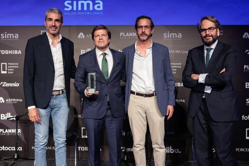 El director general de Negocio de Aedas Homes, Alberto Delgado; el Co-CEO de la constructora 011h, José Manuel Villanueva y el director de Bauman Arquitectura, e Ibán Carpintero, han recogido el premio otorgado a 'Fioresta'; mientras que la directora técnica de Aedas Homes, María G.Matiacci; y el director de Aplicaciones y Data de Aedas Homes, Jorge Valero,han sido los encargados de recibir el galardón por 'GPT Arquitecta, powered by Nidus'.