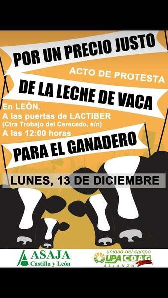 Asaja y la Alianza UPA-COAG continúan su campaña de movilización en unidad de acción en defensa de los ganaderos de vacuno de leche de la región con una protesta este lunes, 13 de diciembre, frente a las puertas de la fábrica Lactiber en León.
