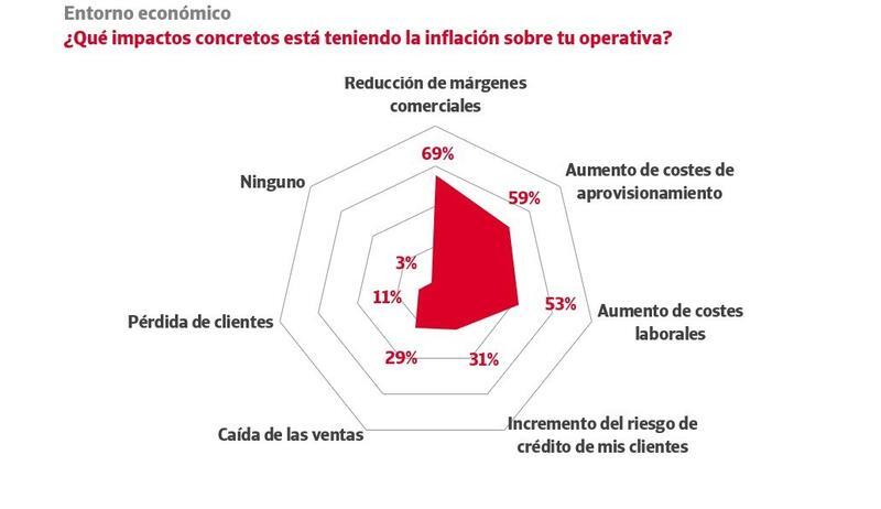 El estudio revela que el 53% de las empresas está viendo incrementados sus costes laborales, un 59% ha visto aumentar sus costes de aprovisionamiento, mientras que el 31% de las empresas percibe un deterioro del riesgo de crédito de sus propios clientes a causa de la inflación.