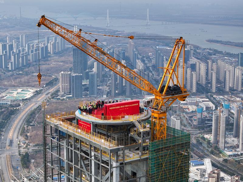 NANJING, Jan. 16, 2024 -- An aerial drone photo taken on Jan. 16, 2024 shows the construction site of the second-phase project (east section) of the Nanjing Financial City in Nanjing, east China's Jiangsu Province. The main structure of the second-phase project (east section) of the Nanjing Financial City was capped on Tuesday. With a gross floor area of around 429,000 square meters, the project is designed as an architectural complex comprising officing, hospitality, housing and commercial facilities.,Image: 837596210, License: Rights-managed, Restrictions: , Model Release: no, Credit line: Li Bo / Xinhua News / ContactoPhoto