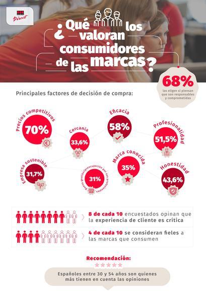 El informe también refleja cuáles son los principales factores de decisión a la hora de realizar una compra. El primero hace alusión a los precios competitivos (70%), seguidos de la eficacia (58%), la profesionalidad (51,5%) y la honestidad (43,6%) de las marcas. A continuación aparece que sea conocida (35%), la cercanía (33,6%), la sostenibilidad y el cuidado por el medio ambiente (31,7%), y la buena gestión y preocupación por sus profesionales (31%).