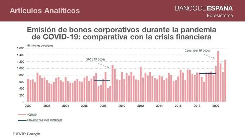 El Banco de España ha constatado que tanto en la crisis financiera global como en la crisis del coronavirus se alcanzaron niveles récord de emisiones de bonos por parte de las empresas no financieras y las financieras no bancarias de las economías avanzadas, si bien el coste para los emisores fue "sustancialmente menor" durante la pandemia.