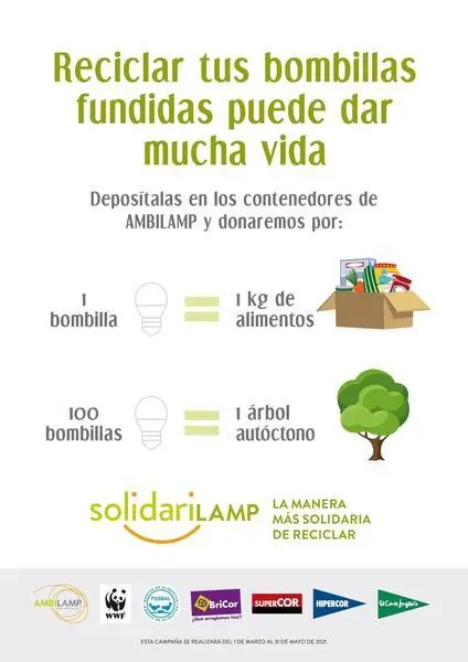 Por cada 100 bombillas recogidas, se donarán 100 kilos de alimentos a la Federación Española de Bancos de Alimentos (FESBAL) y se plantará un árbol autóctono en colaboración con WWF.