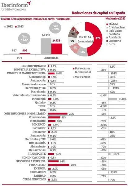 El importe de las reducciones de capital disminuyó hasta noviembre un 32% interanual, según Iberinform