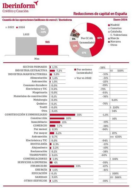 El importe total de las reducciones de capital ha caído en un 43% en enero, hasta los 915 millones de euros, frente a los 1.615 millones en el mismo mes de 2023, según Iberinform (Crédito y Caución), que analiza los datos del Registro Mercantil.