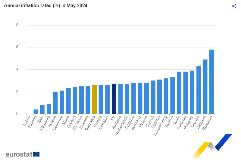 Entre los países con el menor IPC destacan Letonia (0,0%), Finlandia (0,4%) e Italia (0,8%). Las tasas más elevadas de este mes corresponden a Rumanía (5,8%), Bélgica (4,9%) y Croacia (4,3%), según Eurostat.