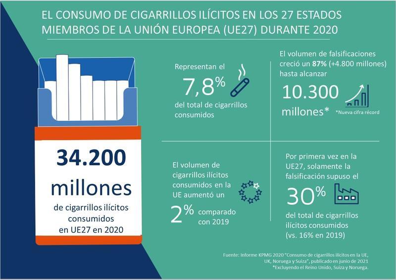 En España, mientras que en 2020 las ventas en el mercado legal disminuyeron un 8%, la consultora estima que el volumen de cigarrillos ilícitos consumidos incrementó en 2020 en un 14%, hasta alcanzar los 1.751 millones de cigarrillos de contrabando y falsificados.