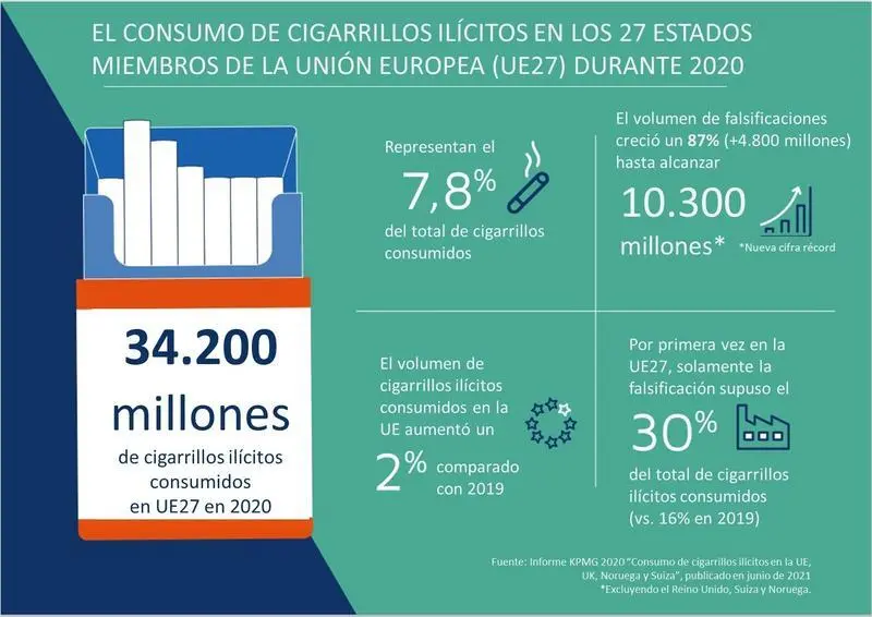 Respecto a Europa, el informe estima que, mientras que el consumo total de cigarrillos sigue disminuyendo, el porcentaje de cigarrillos ilícitos aumentó medio punto porcentual hasta alcanzar el 7,8% del consumo total en 2020, llegando a los 34.200 millones de cigarrillos consumidos en los 27 Estados miembros de la UE.