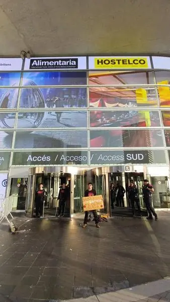 Activistas de Futuro Vegetal han protestado este martes ante el salón Alimentaria & Hostelco, en Fira de Barcelona Gran Via, contra la acogida del evento "a la promoción de las grandes corporaciones cárnicas".