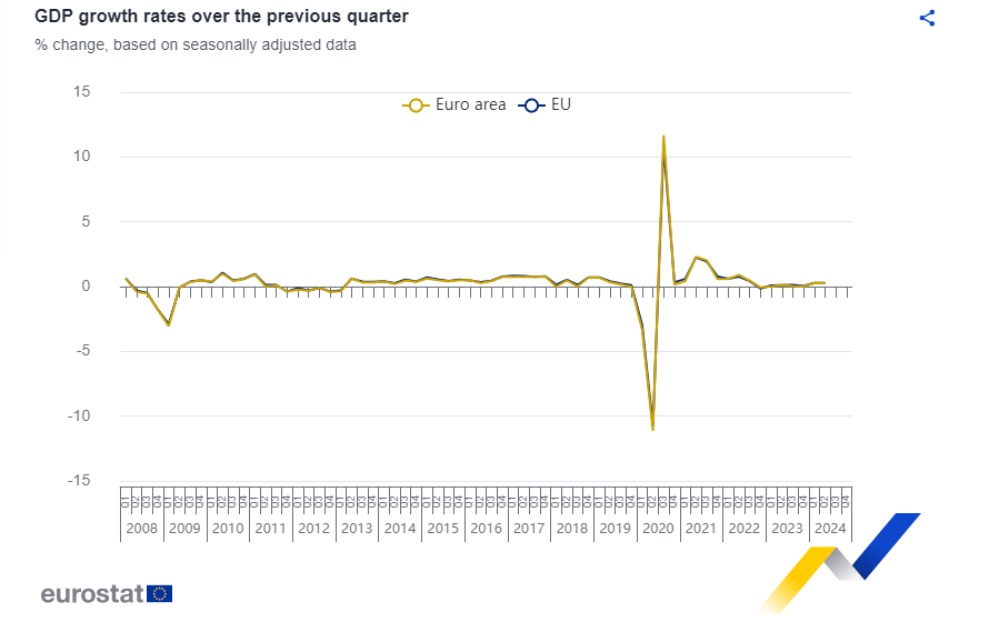 La economía de la eurozona creció más de lo esperado en el segundo trimestre gracias a que el crecimiento de otros países palió la contracción económica alemana. Francia, España e Italia siguen creciendo, especialmente las dos primeras, y eso compensó la caída del 0,1% alemán debida a un descenso en la inversión en equipos y edificios. Irlanda registró el crecimiento más fuerte en el trimestre, un 1,2%. El PIB de la eurozona aumentó un 0,3%, por encima del 0,2% previsto por los analistas.