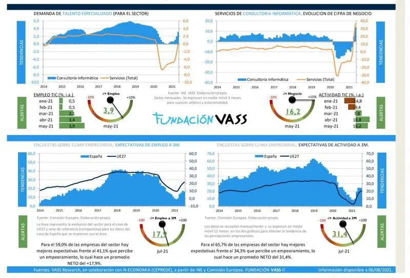 La facturación de las empresas del sector de servicios TIC ha crecido un 16,2% interanual entre mayo de 2020 y mayo de 2021, según el TIC Monitor de Vass. Así, dos de cada tres compañías del sector auguran un incremento de la facturación entre agosto y octubre.