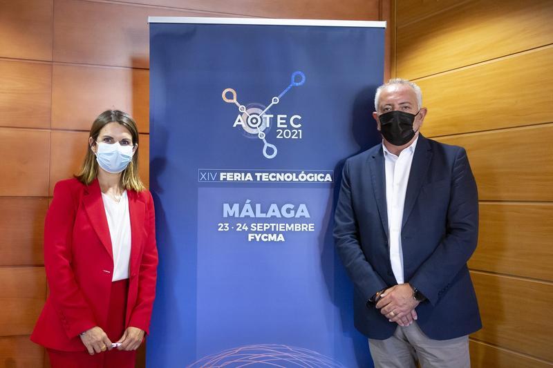La concejala delegada de Innovación y Digitalización Urbana del Ayuntamiento de Málaga, Susana Carillo, y el presidente de Aotec, Antonio García Vidal, han presentado la muestra, una de las citas destacadas en la agenda anual del sector 'teleco', que se celebrará los días 23 y 24 de septiembre en el Palacio de Ferias y Congresos de Málaga (Fycma).