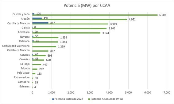 En términos de crecimiento, las comunidades que más potencia eólica instalaron en 2022 fueron Castilla La Mancha, con 837 MW más, Aragón, con 492 MW, y Castilla y León, con 105 MW.