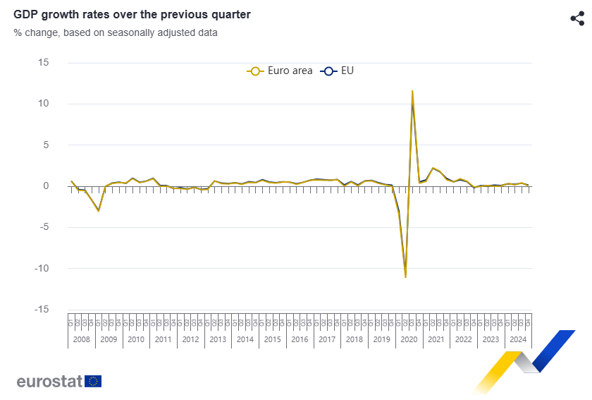 El crecimiento económico en la zona euro sufrió un inesperado estancamiento al cierre del año pasado, afectado por la incertidumbre política en sus principales economías. De acuerdo con Eurostat, el Producto Interno Bruto (PIB) del cuarto trimestre se mantuvo sin variación respecto a los tres meses anteriores, desafiando las previsiones de un modesto crecimiento del 0,1%.