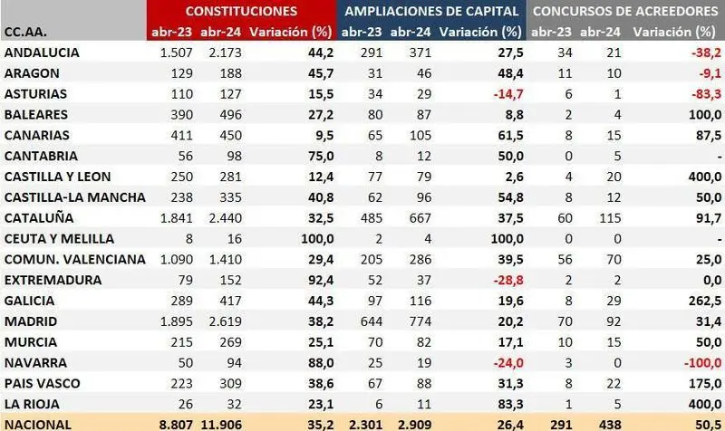 En concreto, todas las comunidades autónomas se anotaron aumentos interanuales, sobre todo Ceuta y Melilla (un 100% más de constituciones frente a abril de 2023), Extremadura (+92,4%), Navarra (+88%) y Cantabria (+75%).