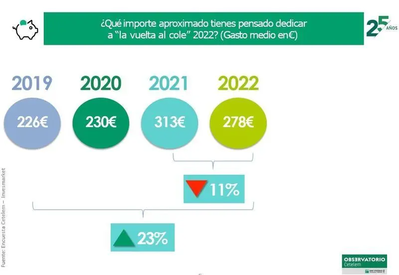 Las cifras de intención de gasto suponen, no obstante, un incremento del 23% respecto a la última cifra pre-pandemia, la del 2019, que situaba el gasto medio de los españoles en 'la vuelta al cole' en 226 euros.