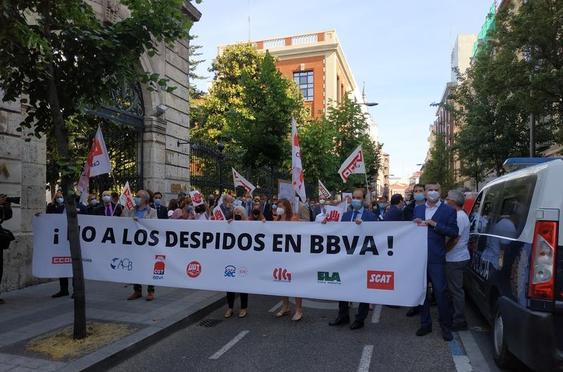 Los sindicatos CCOO, ACB y UGT, que representan más del 70% de la plantilla, convocaron un paro parcial de 09.00 a 11.00 horas en contra del despido colectivo que supondrá la salida de 3.305 empleados de BBVA.