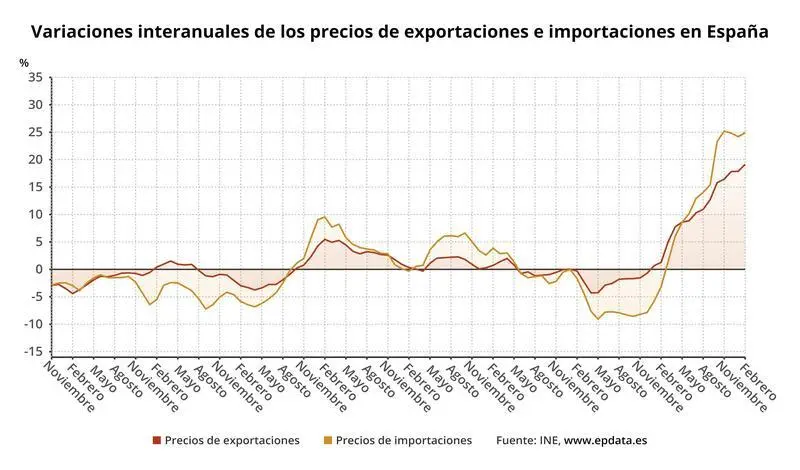 Por su parte, los precios de importación de dichos productos se incrementaron un 24,9% en comparación con febrero de 2021, siete décimas más que en el mes anterior. En esta evolución influyeron principalmente los bienes de equipo, cuyos precios de importación aumentaron un 5,8%, casi 3,5 puntos por encima de la tasa de enero, por el encarecimiento de la fabricación de vehículos de motor.