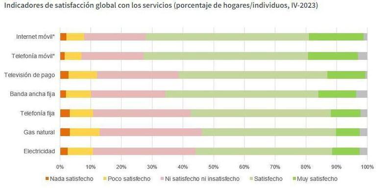 Los servicios de telefonía móvil e internet móvil son los mejor valorados por los españoles, mientras que los de gas natural y electricidad son los peor vistos por la ciudadanía, según el último Panel de Hogares de la Comisión Nacional de los Mercados y la Competencia (CNMC), correspondiente al cuarto trimestre del 2023.