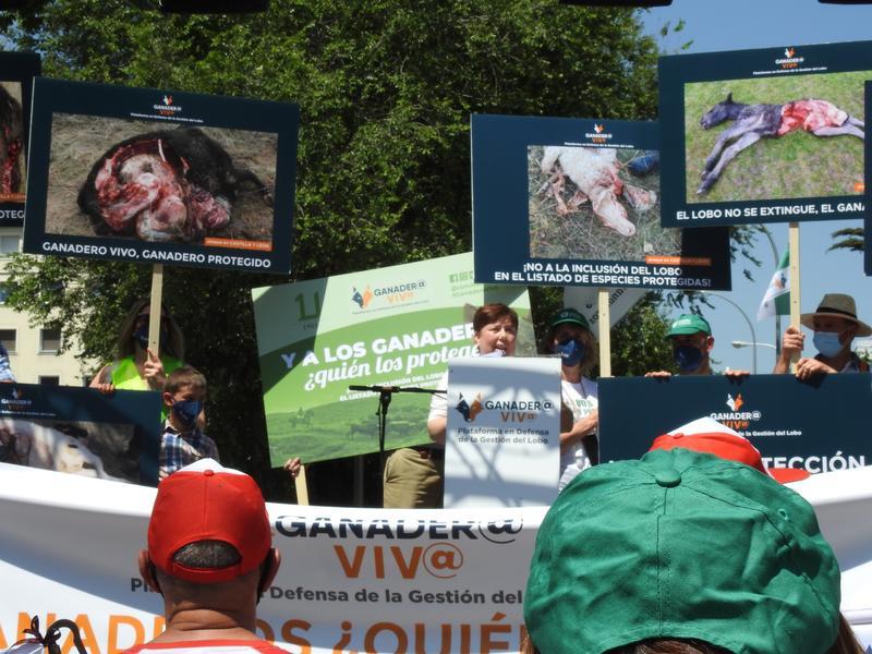 Durante la concentración, la portavoz de la Plataforma en Defensa de la Gestión del Lobo 'Ganader@ Viv@' y ganadera Merche Fernández ha aseverado que "el lobo no está en peligro de extinción, y no hay ningún estudio científico ni técnico que lo avale", sino que esa decisión obedece a "un tema social y patrimonial".