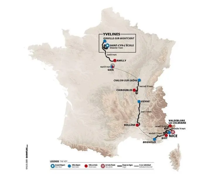 La presente edición de la carrera gala contará con ocho etapas, tres finales en alto y una contrarreloj incluidos, y una distancia total de 1.239 kilómetros entre Saint-Cyr-L'École y Niza, final histórico de la prueba.