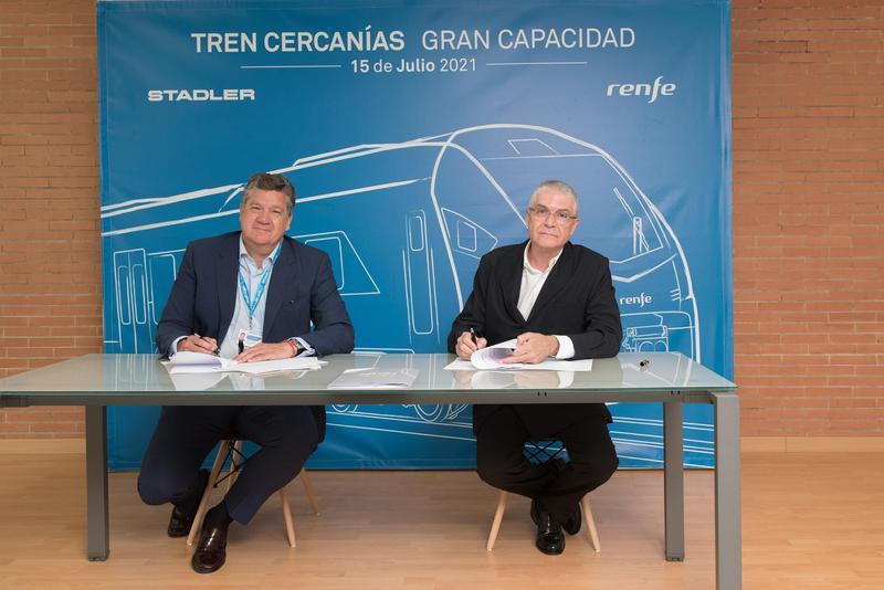 Los presidentes de Renfe y de Stadler Rail Valencia, Isaías Táboas e Iñigo Parra, respectivamente, han firmado este jueves el contrato para la compra de 59 trenes de gran capacidad para Cercanías, por importe de 998 millones de euros.