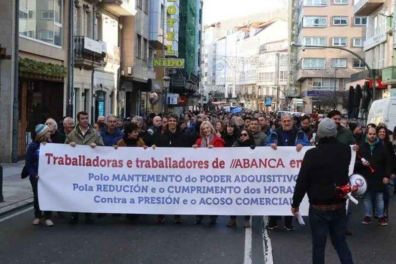 En torno a un millar de trabajadores y trabajadoras de Abanca se han movilizado en A Coruña, en una protesta convocada en Galicia por los sindicatos CIG y ASCA, para reclamar medidas con las que compensar la "brutal pérdida de poder adquisitivo desde 2010", así como la apertura de una negociación para cuestiones como la reducción de los horarios laborales.