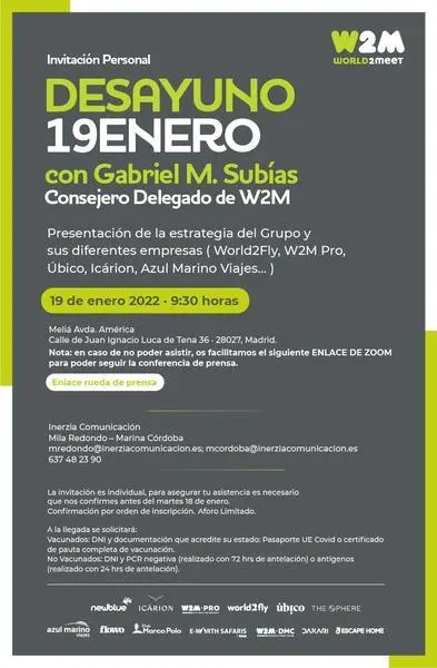 World2meet (W2M), el grupo turístico vertical de Iberostar, ha presentado su presupuesto de 2022, en el que prevé alcanzar una facturación de 1.121 millones de euros tras un 2021 que "no ha dado dinero", como ha reconocido su consejero delegado, Gabriel M. Subías Cano, en rueda de prensa.
