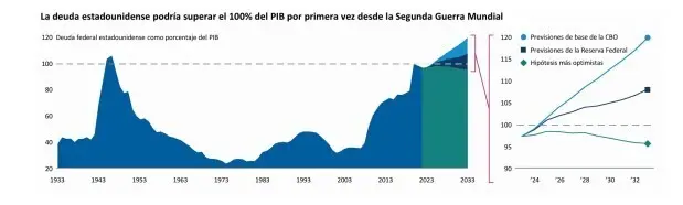 ¿Cuándo es demasiado alto el nivel de deuda? Esa es la cuestión, ya que a los ciudadanos y los inversores estadounidenses cada vez les preocupa más el elevado nivel de deuda pública. La deuda total superó los 29 billones de dólares en el cuarto trimestre de 2024, acercándose así al 100% del producto interior bruto (PIB). Y la Oficina de Presupuestos del Congreso anticipa que seguirá aumentando en el futuro.