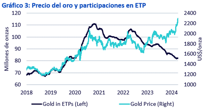 El sentimiento de los inversores hacia el oro no ha mejorado de forma generalizada, y los inversores en productos cotizados (ETP) siguen al margen de este repunte (Gráfico 3). Es inusual que los inversores en ETP se abstengan de participar en un rally del oro durante tanto tiempo en el ámbito financiero. Sin embargo, las salidas de fondos de los ETP sobre oro se han ralentizado y no hemos observado signos de recogida de beneficios debido a la fuerte subida de los precios.