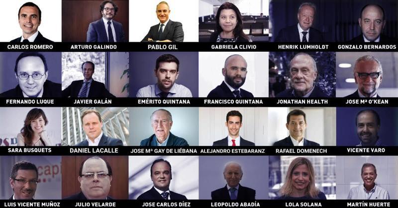 Para una imagen más global de la situación económica, destacamos las colaboraciones de varios de los responsables de estrategia de las principales entidades españolas como Rafael Doménech de BBVA, Pablo Gil de XTB, Francisco Quintana de ING, Carlos Romero de AZ Valor o Henrik Lumholt, ex de Bank of América. También podremos disfrutar de la visión de expertos en el sector de la comunicación como Luis Vicente Muñoz de Capital Radio, Fernando Luque de Morningstar o Sara Busquets de Investing.