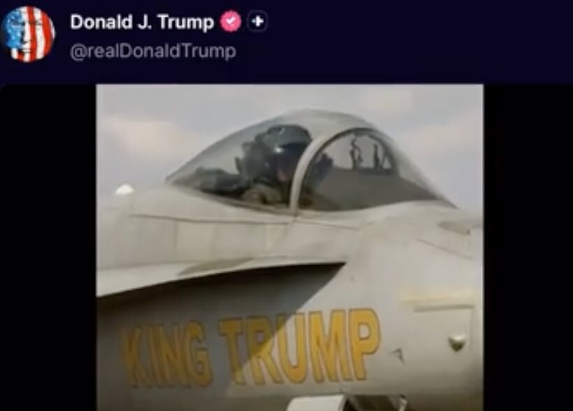 Trump posts insane video of himself as a king flying a jet that drops feces on protestors below. Seriously