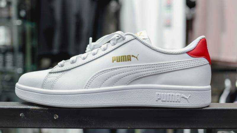na zapatilla blanca de Puma, fotografiada de perfil, con el logotipo en dorado y un detalle rojo en el talón, sobre un fondo desenfocado de estilo comercial, UNSPLASH / ZAKARIA_ISSAAD
