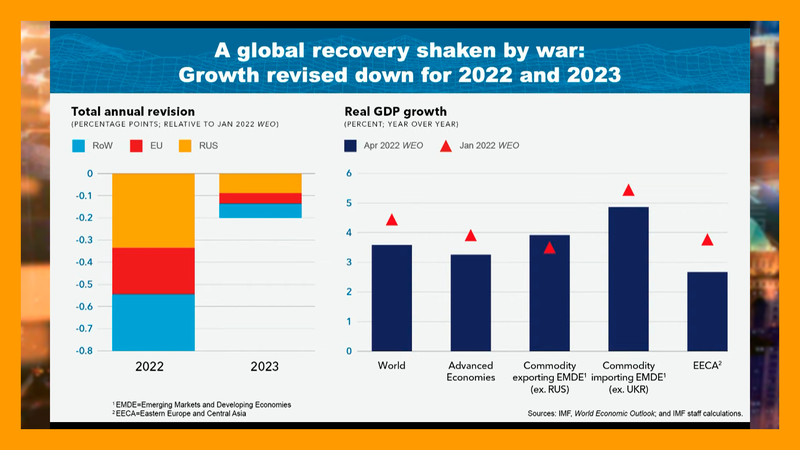 El FMI alerta del impacto de la guerra en Ucrania sobre la economía mundial y rebaja su previsión de crecimiento. Cree que el PIB global crecerá un 3,6% en 2022 frente al 4,4% esperado anteriormente y asegura que las previsiones han empeorado “significativamente” desde la última actualización.