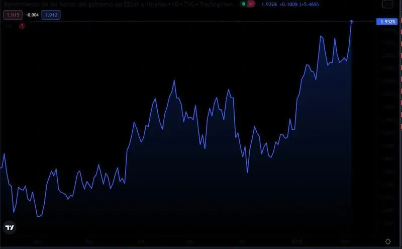 El rendimiento de los bonos referenciales a 10 años del Tesoro estadounidense está tocando este viernes máximos desde enero de 2020 y se sitúa por encima del 1,93%.