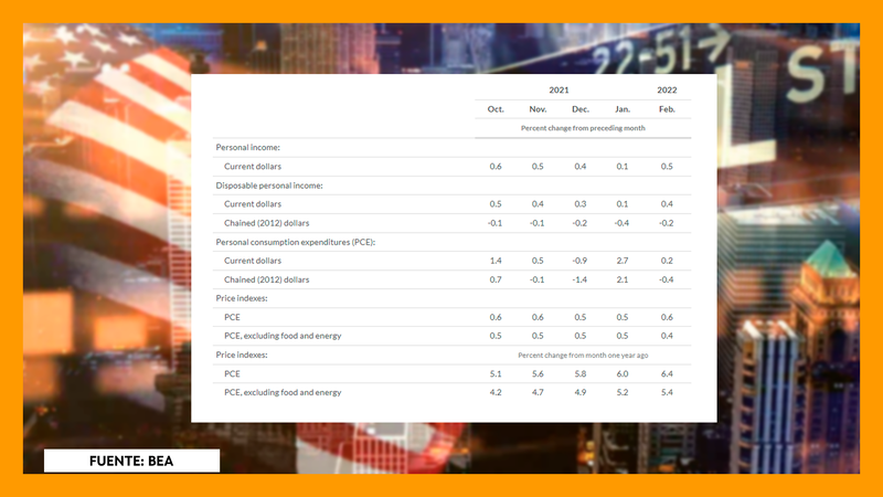 Excluyendo los precios de los alimentos y la energía, el índice de precios de gastos de consumo personal aumentó un 5,4 % con respecto al mismo período de 2021, el mayor salto desde 1983. Incluyendo gasolina y comestibles, la medida principal de PCE saltó un 6,4%, el ritmo más rápido desde 1982.
