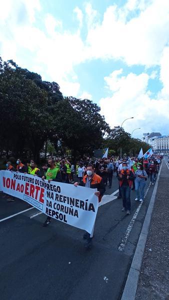 Una marcha multitudinaria ha recorrido este sábado A Coruña en "repulsa" del Expediente de Regulación Temporal de Empleo (ERTE) planteado por Repsol para la refinería, que afectaría al 31% de la plantilla, 212 empleados; y para demandar "inversiones" que garanticen su "un futuro estable" para la misma.