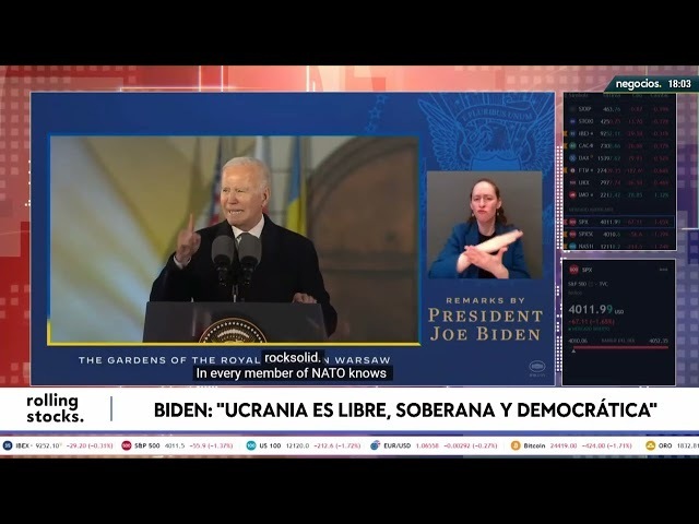 Destaca como Ucrania seguirá defendiéndose de la agresión rusa. EEUU y aliados seguiremos dándole apoyo. Presume de la OTAN como potente alianza militar. El compromiso de EE.UU. con la OTAN es una roca, es sólido. Un ataque contra la OTAN es un ataque contra todos.