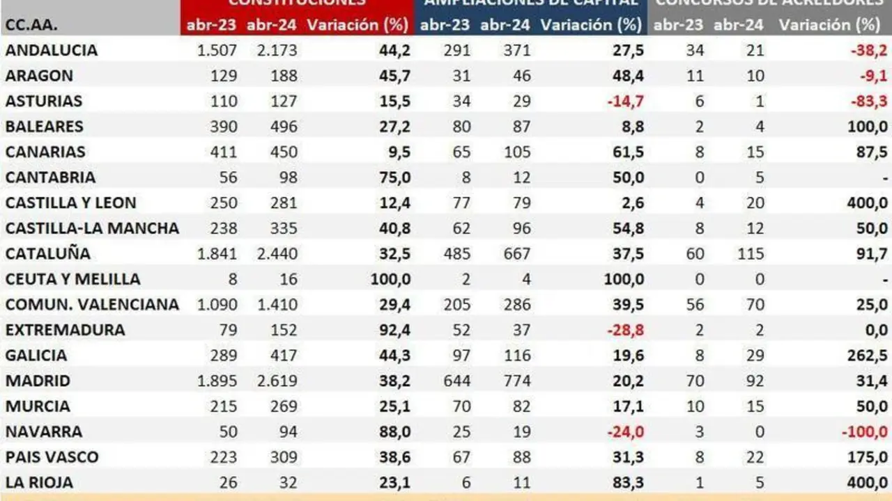MADRID, 17 (EUROPA PRESS) Las constituciones de empresas aumentaron un 35,2% en abril respecto al mismo mes del año anterior, hasta las 11.906…